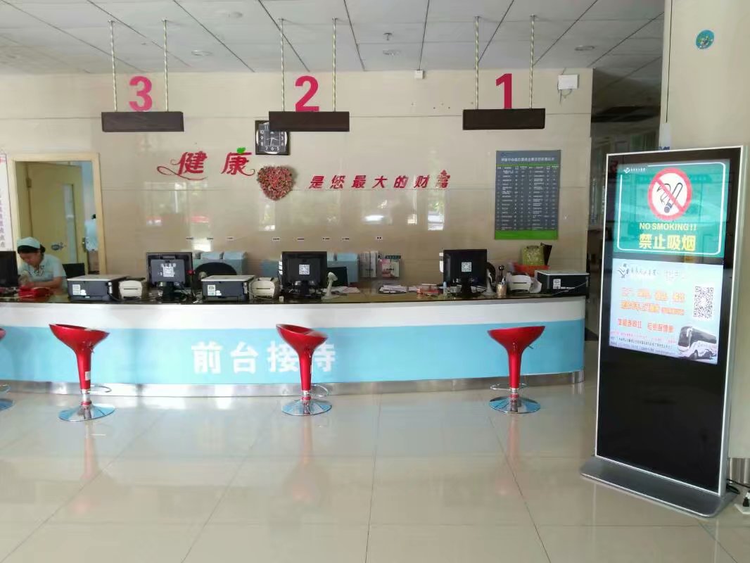 立式廣告機,觸摸一體機,擺放在醫院入口、大廳、掛號處,播放醫院的文化宣傳,最新醫療政策、醫院動態及資歷展示;醫院樓層介紹,地圖展示,科室導航信息等。